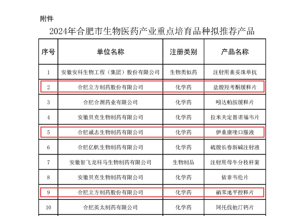 為培育發(fā)展新動(dòng)能、促進(jìn)生物醫(yī)藥產(chǎn)業(yè)高質(zhì)量發(fā)展,合肥市工業(yè)和信息化局近日公布了《2024年合肥市生物醫(yī)藥產(chǎn)業(yè)重點(diǎn)培育品種》目錄,合肥立方制藥股份有限公司獲批上市的鹽酸羥考酮緩釋片、硝苯地平控釋片和合肥誠(chéng)志生物制藥有限公司(“立方制藥”全資子公司)獲批上市的伊曲康唑口服液等3款產(chǎn)品成功入選目錄。